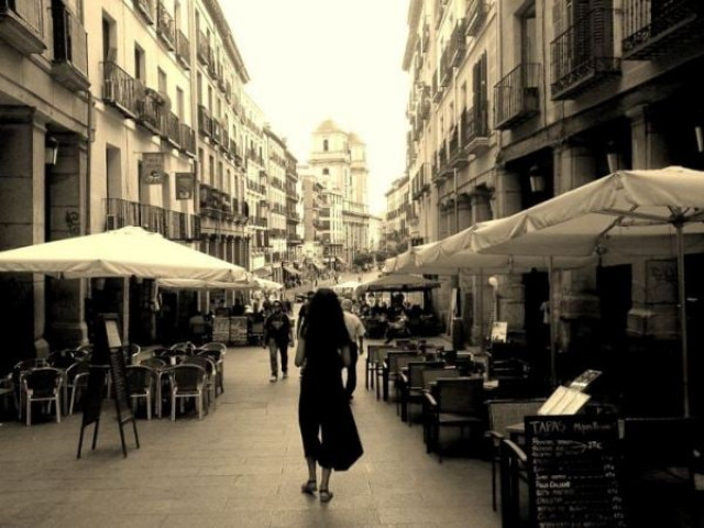 Sitting here in our apartment, a cozy, parquet-floored one-bedroom affair, I can hear the babble of excited young voices below the window, a medley of idioms and accents; the clink of glasses and clatter of dishes from neighbouring restaurants; the smoky strumming of a flamenco guitar, the wheezy chorus of an accordion; the cries of Nigerian hawkers and Bengali street-peddlers, and the low hum of the occasional taxi cab, rolling along the cobbled streets of this lively old pedestrian barrio of the Spanish capital.