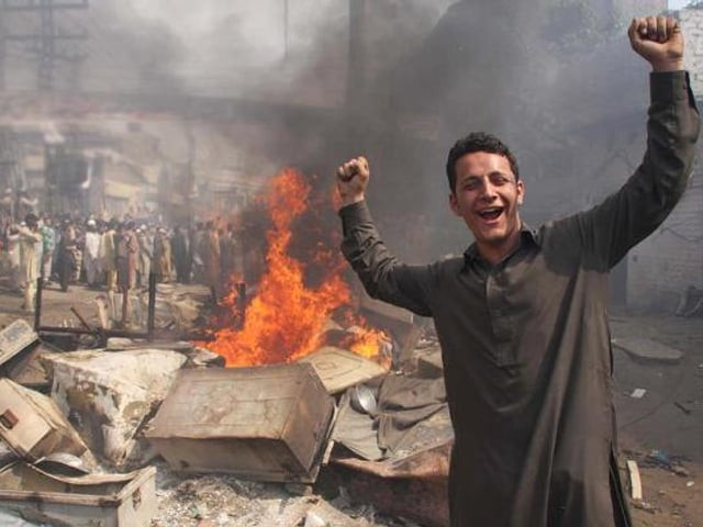 Let me remind you. This image is less than three-years-old. This is March 2013, Lahore. Triumphant and probably feeling much closer to God, this man stands before a burning heap of what was once a Christian colony.