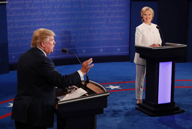Republican nominee Donald Trump (L) speaks as Democratic nominee Hillary Clinton looks on during the final presidential debate at the Thomas & Mack Center on the campus of the University of Las Vegas in Las Vegas, Nevada on October 19, 2016. PHOTO: AFP