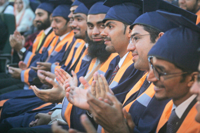 Wearing royal blue convocation robes with orange frills, the graduating students walked in the academic procession amid enthusiastic cheers by their parents and family members. High hopes were attached with the graduates who decided to get themselves enrolled in the business school's rigorous MBA programme that was launched in collaboration with Cambridge University's Judge Business School around two years ago.