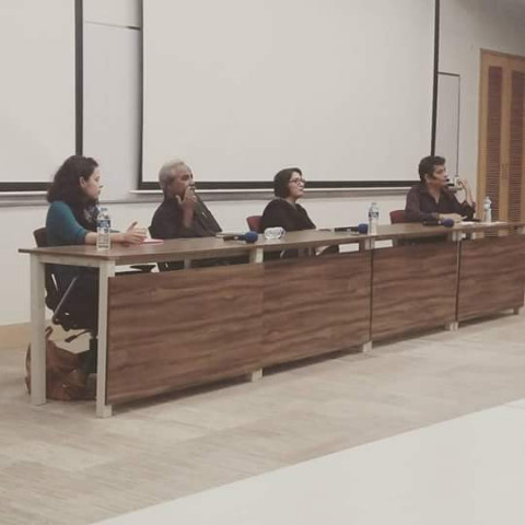 The panelists Saher Baloch, Akhter Baloch and Mahim Maher sit alongside the moderator Mohammad Hanif at Habib University on October 17, 2015. PHOTO: TWITTER/@UzairIbrahim_