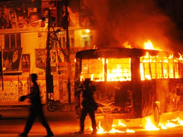 We weren’t fully done with the usual parade when a couple of minutes of scattered firing, followed by the stench of burning rubber and petrol forced us to rush outside the hall to see what was going on, and lo and behold, there it was; the sight/act/incident/habit (I really don’t know what to call it) Karachi is increasingly coming to be known for: a burning bus!