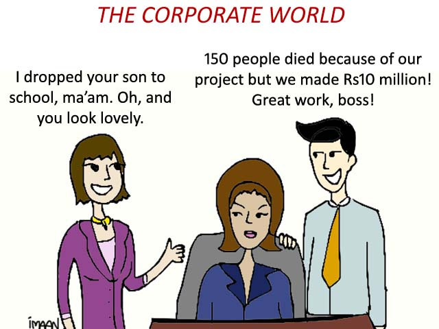 Moreover, they do not follow labour and environmental laws and fail to provide their employees with the facilities and wages as per the laws stated. How often have you seen a worker wearing no protective gear, carrying out perilous duties? Just think of the people we lost in the Baldia fires. If these workers were treated as they were meant to and not as money-making machines, they might have still been alive.