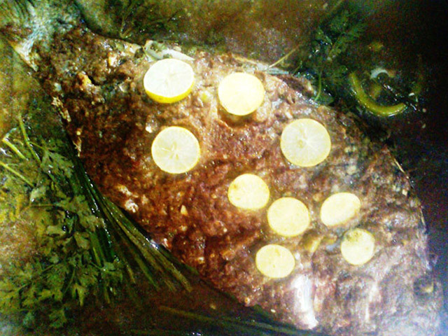 After you marinate the fish, the cavity in the stomach can be filled with fresh greens and left for an hour at the most. If you leave it for longer, the tamarind paste will become runny and the flesh will start losing its own sweet taste. During summer, the prepared fish should be kept in the fridge and tightly covered in foil.