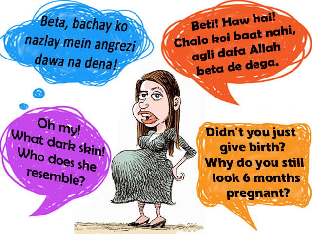Yes, my dear fellow moms, if you thought you are done with the toughest part after your pregnancy experience, hold on! Be prepared to hear how you still look six month pregnant, as if you were meant to come out looking like Mahnoor Baloch from the labour room. If you try to meekly protest that you just had a major surgery three days ago, you will get to hear how their sister’s friend’s cousin’s neighbour looked absolutely perfect after her fourth C-Section.