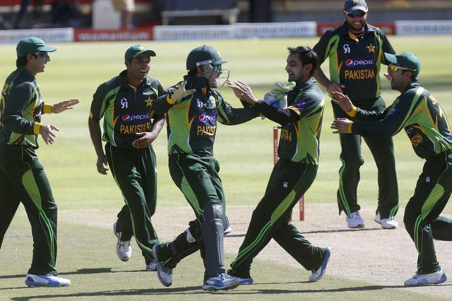 Pakistan's cricketer Anwar Ali and Ahmed Shahzad ( back) celebrates the wicket of South Africa's David Miller during the first One day International (ODI) Cricket Match between Pakistan and South Africa at Newlands Cricket Ground in Cape Town on November 24, 2013. Photo: AFPAs Mahendra Singh Dhoni likes to put it, Pakistan too should play ‘Horses for Courses’ and field an eleven that is most suited to the playing conditions.