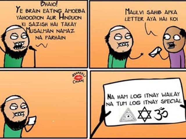 We got in touch with one of those local comic-making shaitaans (devils) for you. They operate under the name of Zehreeli Chummi (poisonous kiss) on Facebook and have 23,000 fans on their page.