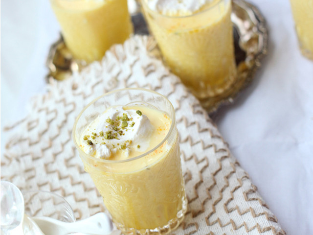 Present your guests with a saffron-imbued cold drink – Shahi Zafran ka sherbet – upon their arrival. The dollop of fresh cream on top with pistachio dust is a lovely way to do something a little extra special on Eid.
