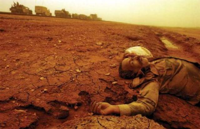 A soldier’s camouflaged helmet peeks out of a field of pink and white poppies in Afghanistan, an Israeli tank enters Gaza underneath clouds and dust, a niqabi walks in the rust ochre air on a Baghdad street; a crushed piano sits amidst rubble in Saddam Hussein’s son’s palace.
