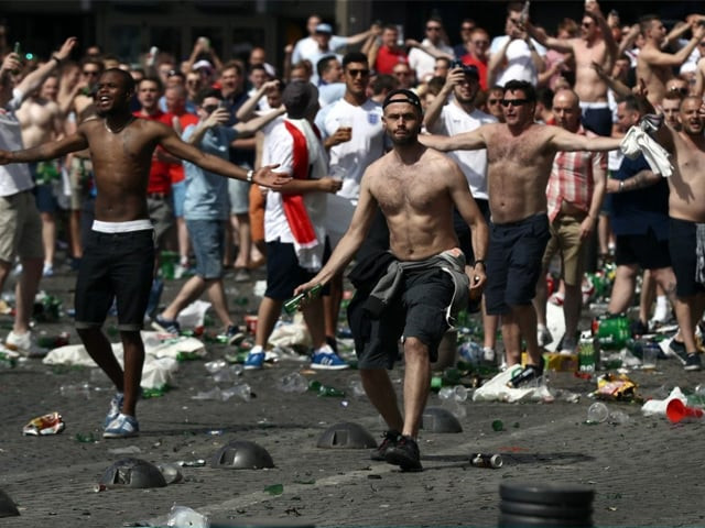 A woman holding a French flag (in pink) throws a beer bottle towards English football fans as they gather in the old town area of Marseille.Photo: SkysportsEnglish football supporters along with their Russian counterparts laid siege to the port city, drinking, brawling, swearing, smashing bottles and heads, and generally giving the law enforcement agencies a chance to earn their salary.