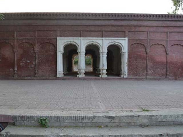 This Samadhi was perhaps once located within the boundaries of the bagh, and is now separated from it by a wall. In order to reach the monument, one has to traverse through the old, narrow streets of the Lahori darwaza neighbourhood. This area is part of the walled city of Gujranwala and is dotted with numerous historic structures, a few of which are still standing. The Lahori darwaza is a high arched gate, made of small red bricks and the street ahead is lined with paan shops, tea stalls, and other shops selling everyday goods.