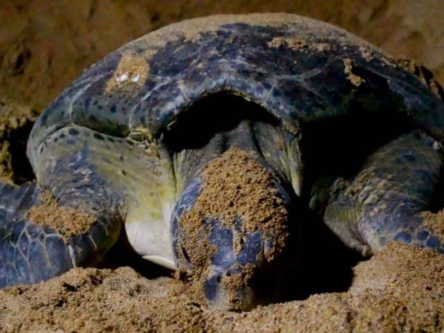 Two turtles had come to the beach and were in the process of digging pits to lay eggsThe two turtles that came for nesting were approximately 50 and 65 years of age respectively, as suggested by WWF-Pakistan’s marine expert. During this stage of nesting, the turtles are not to be disturbed, even by the use of light or excessive noise. However, once they had settled in and began laying eggs, the group went across to Sandspit beach and observed them nesting and closing their pits with their flippers.