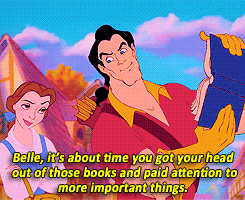 Gaston spots Belle running around with a book in her hand. This is one of the best things about a woman getting a degree and involving herself in education - it lands her a man.