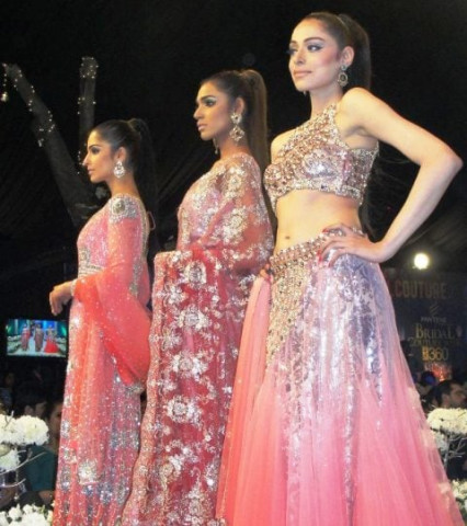 What was exciting was the combination of different fabrics. Models sashayed down the runway wearing lehengas, long ankle-length A-line shirts, saris and angrakhas with infusions of different fabrics like banarsi, chiffon, organza, and velvet alike. In some cases, cotton was skilfully blended in adding that extra something to the dresses. I loved seeing mokesh make a comeback. Culottes and capris in gorgeous plums, reds and purples were a definite trend. Churidaars are here for a while longer, and I am glad. The dresses ranged from traditional and sophisticated to modern and flirty. It was nice to see more Islamabad based designers coming in to main stream such as, Bina Sultan of BNS Couture and Reem Abbasi of Keepsakes (jewellery).