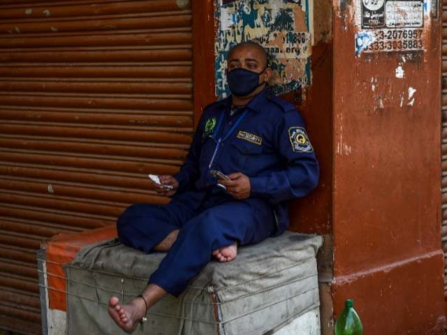 A security guard sits in the area of a shuttered market in Karachi. PHOTO: GETTY