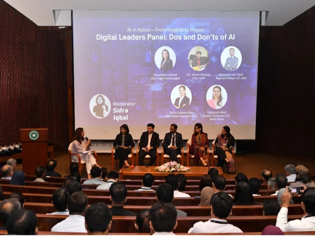 A panel discussion, moderated by Sidra Iqbal (Journalist and Anchor, Aaj TV), followed, featuring Nausheen Ashraf (CEO, 4sight Technologies), Dr Imran Batada (CDO, IoBM), Muhammad Fahd (Regional Director ICT, AKU), Rabia Saleem Rao (CTO, Habib Education Trust), and Tabasum Abid (CTO, Sindh Police). Each panelist brought their unique perspective and expertise into a discussion that covered data sensitivity, gender and AI, mental health risks, the impact of AI on critical thinking, successful AI implementations, and how the use of (and familiarity with) AI differs across generations.