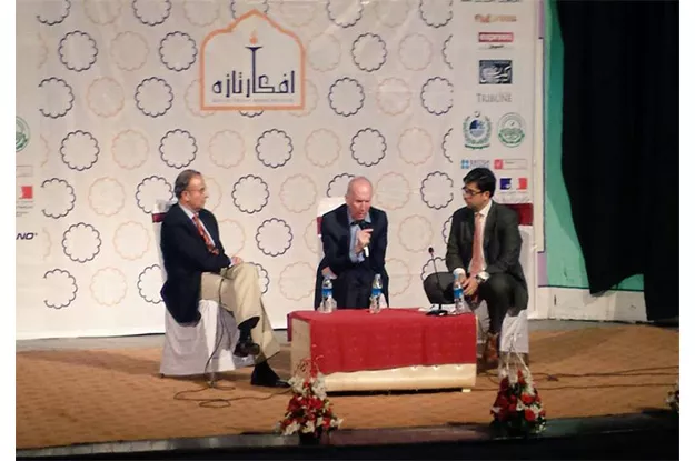 Sir William Blackburne, Mr Justice Syed Mansoor Ali Shah and Mr Feisal Naqvi talking at a session on Justice at Your Doorsteps and the Judiciary in Modern World. PHOTO: fb.com/ITU