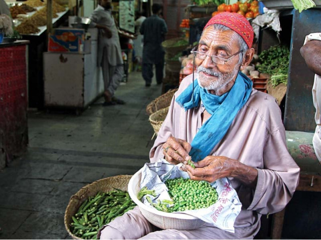 Eighty-year-old Muhammad Hassan, who cannot see, has been sitting at the main gate of Empress Market for the last 35 years. He shells the peas of vegetable vendors and sells matchboxes, earning Rs300 per day. PHOTO: AYSHA SALEEM/EXPRESS
