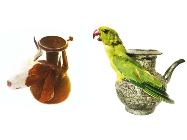 Among all, artist Affan Baghpati’s creations appear to be the most wild and abstract at the same time. A parrot perched on a lota through the technique of taxidermy and a goat’s head resting on the side of Surahi (earthen pitcher), Baghpati’s craft is both different from the rest as well as perhaps very private to the artist.