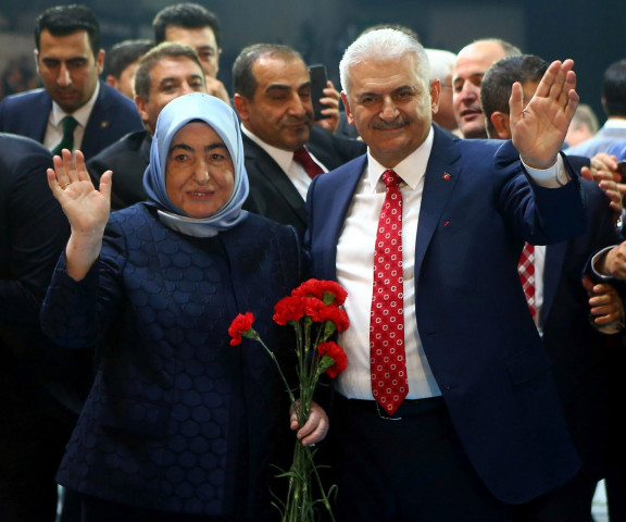 Turkey's Minister of Transport, Maritime and Communication and new chairman candidate for ruling AK Party Binali Yildirim (R) and his wife Semiha Yildirim (L) greet supporters as they arrive for the second extraordinary congress of the AK Party at the Ankara Arena in Ankara, on May 22, 2016. PHOTO: REUTERS