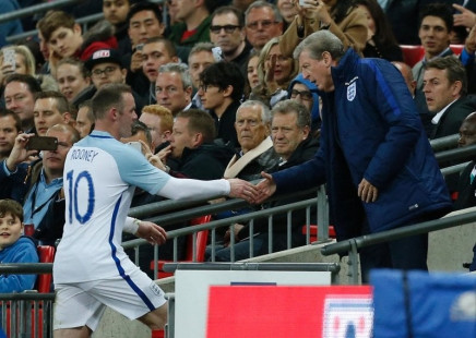 Wayne Rooney (L) shakes hands with Roy Hodgson after being substituted at Wembley stadium in London on June 2, 2016. PHOTO: AFP