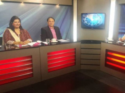 Columnist and rights activist Marvi Sirmad is seen sitting on the left during a private TV show in this Twitter photo of February 28. PHOTO: TWITTER/marvisirmed