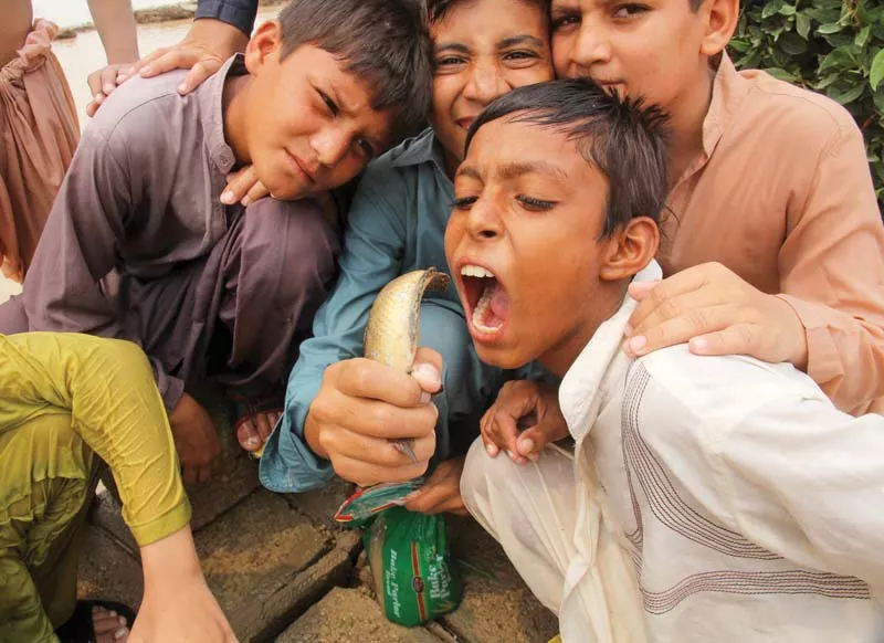 A group of children play with a fish they caught in the water accumulated in Block 5 of Saadi Garden after the downpour earlier this week. PHOTOS: ATHAR KHAN/EXPRESS