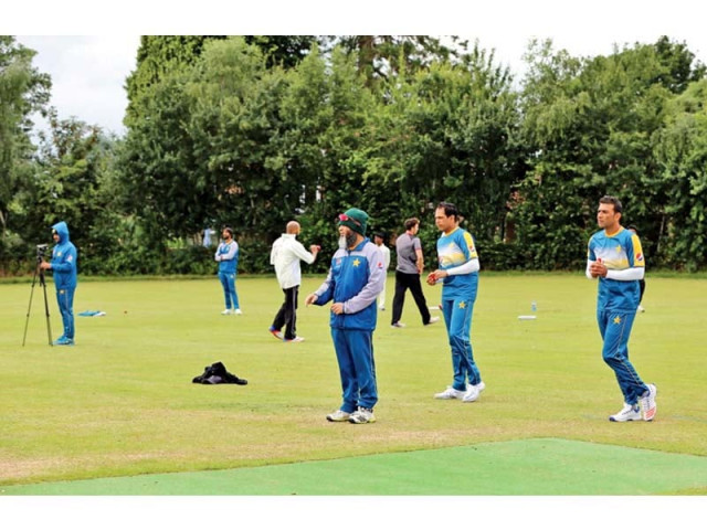 Pakistan players, who landed in England 10 days before the first Test to adjust to the conditions, train ahead of their Test series against England. PHOTO COURTESY: PCB