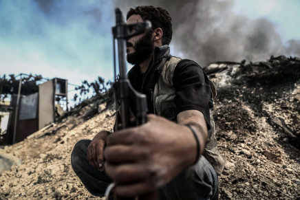 A fighter from the Jaish al-Islam (Islam Army) sits near smoke billowing on the front-line, which they use to take cover, in the village of Tal al-Siwan area of the rebel-held stronghold of Douma, on the outskirts of Damascus. PHOTO: AFP
