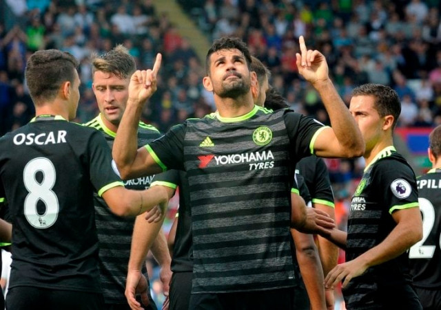 Chelsea's Diego Costa celebrates scoring their first goal against Swansea on September 11, 2016.