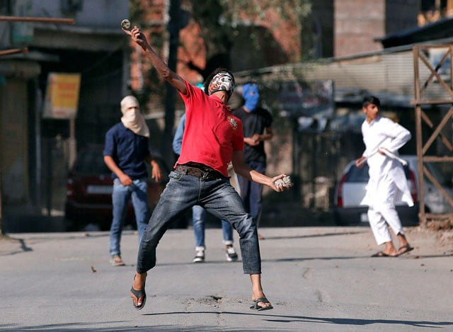 A Kashmiri demonstrator hurls a stone at Indian policemen during an anti-India protest in Srinagar October 14, 2016. PHOTO: REUTERS