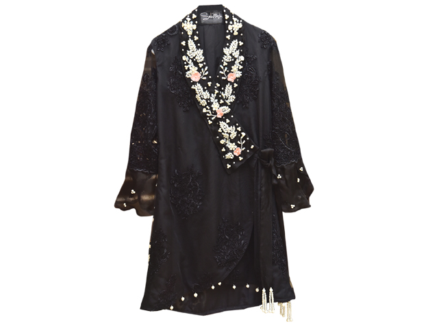 This Sehrish Rehan ‘Kimono Jacket’ is from the designer’s Luxury Pret collection. The classic black piece is heavily embellished with pearl detailing on its neckline and tassels. Delicate pink floral appliqué-work give it a feminine touch. The piece is made using a exquisite chiffon fabric which gives it a luxurious and elegant finish.