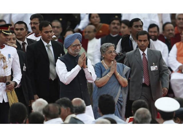 Manmohan Singh (blue turban) and his wife Gursharan Kaur greet the guests as they arrive for Prime Minister Narendra Modi's oath-taking ceremony at the presidential palace in New Delhi May 26, 2014. PHOTO: REUTERS
