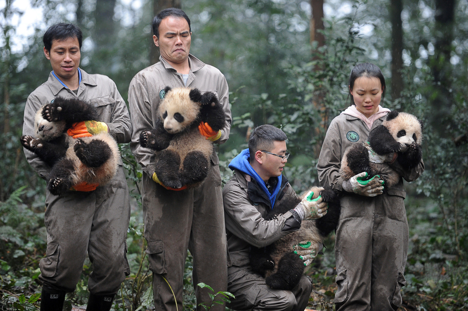 Researchers hold giant panda cubs during an event to celebrate China's Lunar New Year in a research base in Ya'an, Sichuan province, China. PHOTO: REUTERS