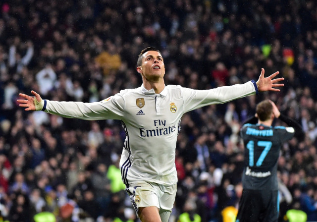 Cristiano Ronaldo celebrates a goal against Sociedad at the Santiago Bernabeu stadium on January 29, 2017. PHOTO: AFP