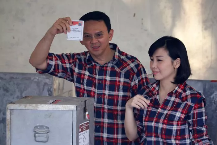 Governor of Indonesia's capital Basuki Tjahaja Purnama (L) shows his ballot as he stands beside his wife Veronica Tan during an election for Jakarta's governor in Jakarta, Indonesia, February 15, 2017. PHOTO: REUTERS