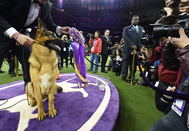 Rumor the German Shepherd and handler Kent Boyles pose for photos after winning Best In Show at the Westminster Kennel Club Dog Show at Madison Square Garden, February 14, 2017 in New York City. PHOTO: AFP