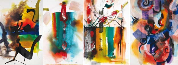 Zaeem has also tried to experiment in the medium, placing wet-on-wet, dry-on-wet, salt technique, shrink-wrap, bubble-wrap, dry flat, round mixed with bleeding effects pitching water colours against acrylic.