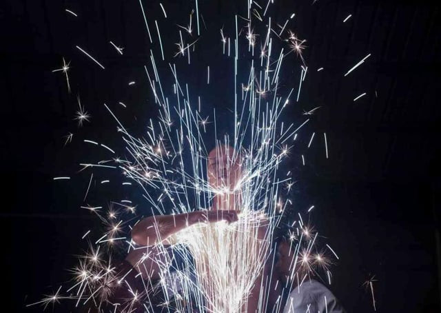 With eyes closed, they lean their faces into fireworks that spit out white sparks