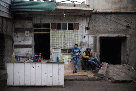 People stand near a fuel stand in the rebel held besieged city of Douma, in the eastern Damascus suburb of Ghouta, Syria February 12, 2017. PHOTO: REUTERS