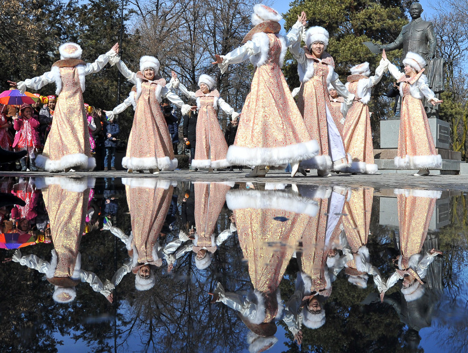 Kyrgyz actors, wearing their traditional costumes, sing and dance during the festivities of Maslenitsa in the Kyrgyzstan's capital Bishkek. PHOTO: AFP