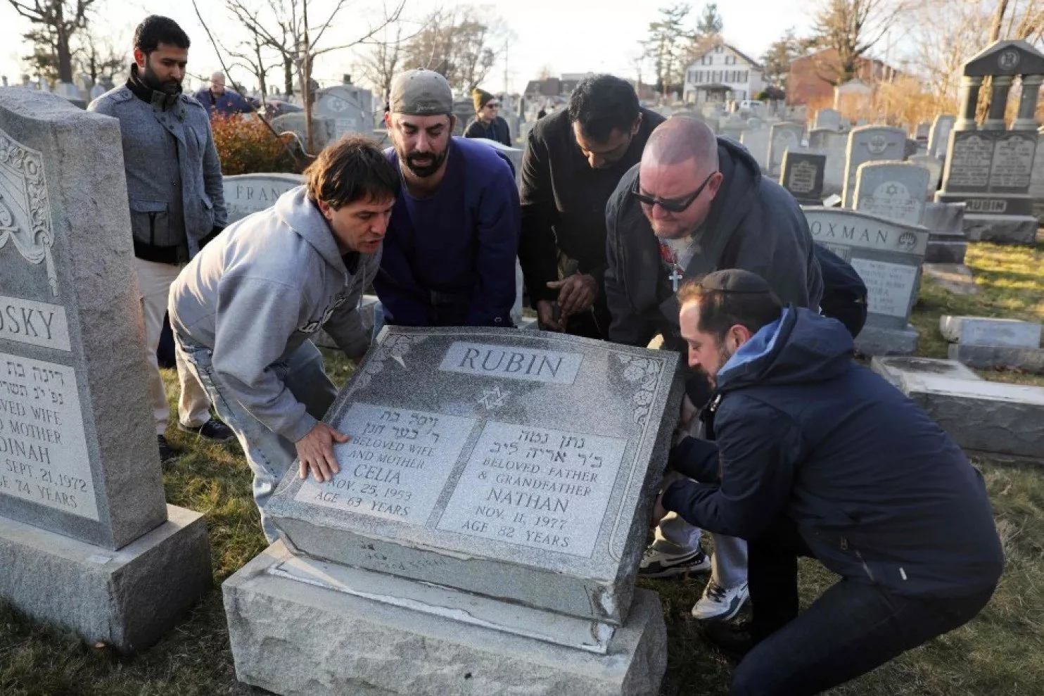 Men help lift a fallen tombstone at the Jewish Mount Carmel Cemetery on Feb. 26 in Philadelphia. Police say more than 100 tombstones were vandalized a week after a Jewish cemetery in St. Louis was desecrated. PHOTO: REUTERS