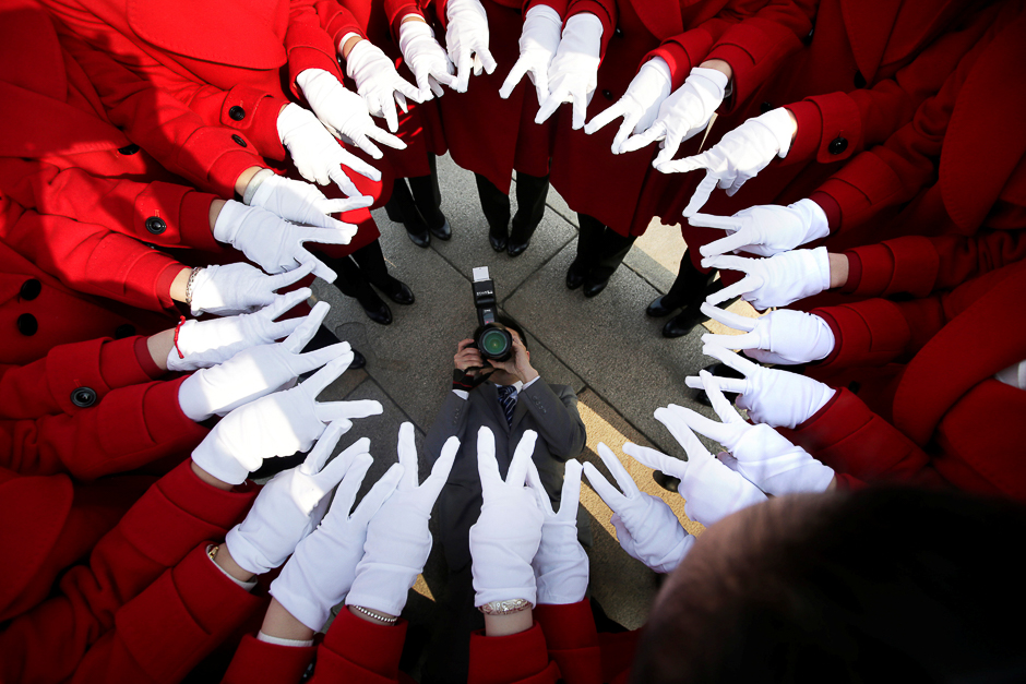 Attendants serving delegates from a hotel pose for a photo at Tiananmen Square as delegates attend a meeting during the annual session of China's parliament, the National People's Congress (NPC), in Beijing, China. PHOTO: REUTERS