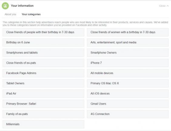 The data Facebook makes public is our interests, email platform, what phone we use, what browser, birthdays, details of friends and family, what our friends like and even stuff we interact with.