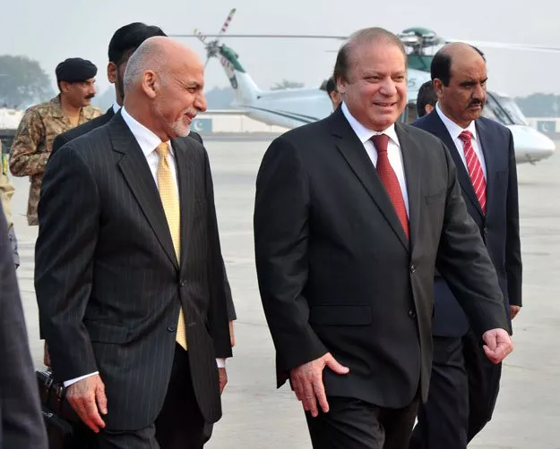 Prime Minister Nawaz Sharif walks with Afghan President Ashraf Ghani upon his arrival at the Nur Khan Airbase in Rawalpindi on December 9, 2015. PHOTO: AFP