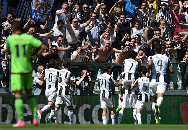 Juventus players celebrate with fans after Juventus' forward from Croatia Mario Mandzukic scored during the Italian Serie A football match Juventus vs Crotone at the Juventus Stadium in Turin on May 21, 2017.