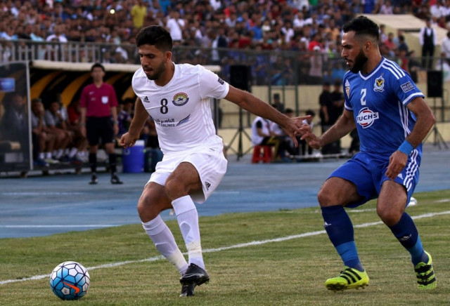Al-Zawraa player Mohannad Abdulraheem (L) vies for the ball against Air Force player Samal Saeed during their AFC Cup West Zonal semi-final football match in Arbil, the capital of the Kurdish autonomous region in northern Iraq, on May 22, 2017.