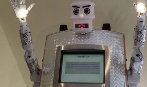 It then asks the believer "what blessing do you want", which results in the robot making a mechanical sound as it raises its arms to the heavens and starts to smile.