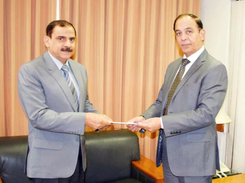 NAB Chairman Qamar Zaman Chaudhry hands over cheque to Air Marshal (Retd) Jamshaid Khan. PHOTO: EXPRESS