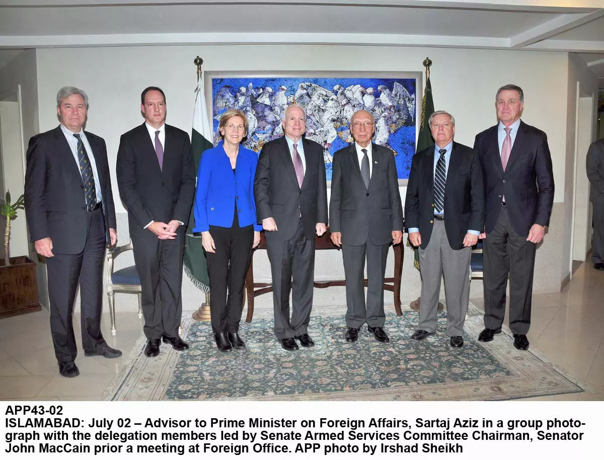 McCain, the Chairman Senate Armed Services Committee, is leading a delegation of US senators including Senator Lindsey Graham, Senator Elizabeth Warren, Senator David Perdue and Senator Sheldon Whitehouse to Pakistan for talks with civil and military authorities on a host of issues covering bilateral ties, current regional and international situation.